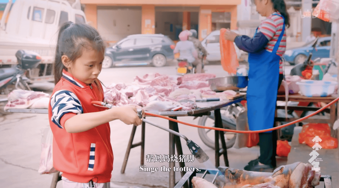 2016年深秋的一个清晨,云南那哈乡的菜市场里,八岁的邬刚云正蹲在自家猪肉摊前,专注地清洗着猪大肠。